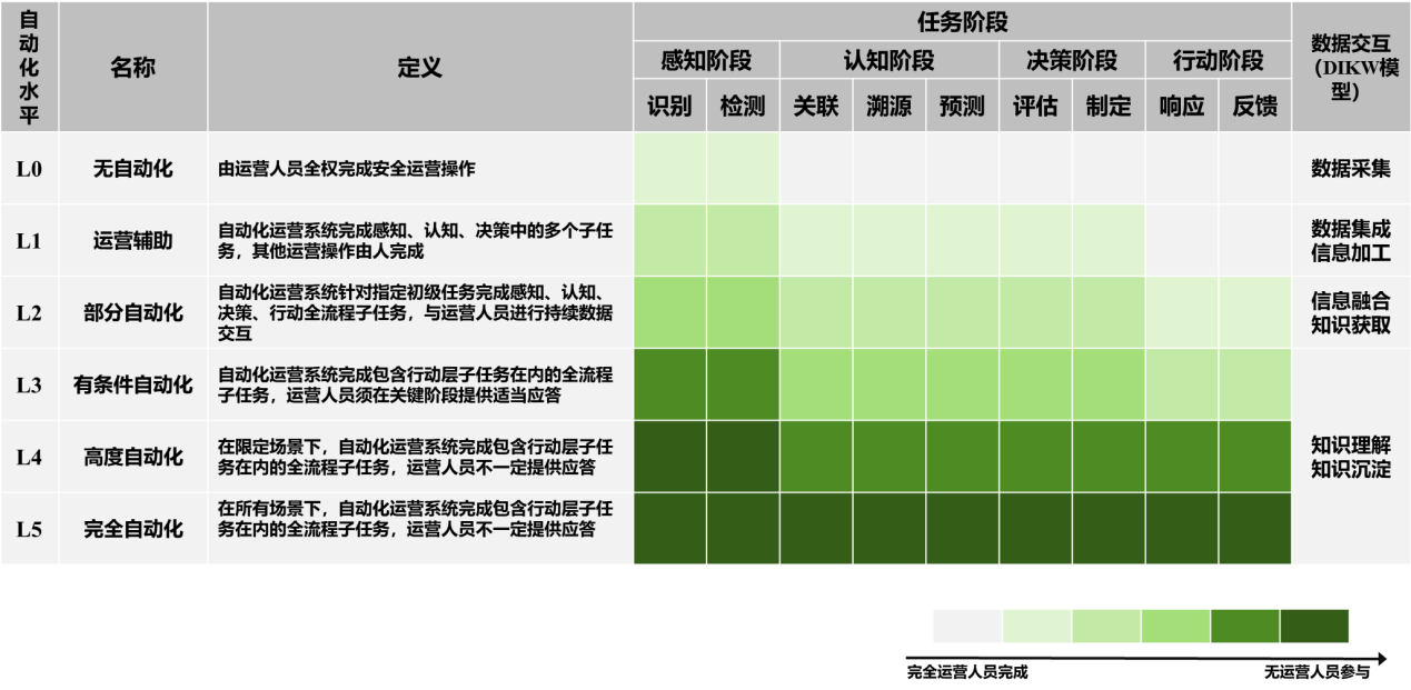 Èçͼ4 Ëùʾ£¬Æ¾Ö¤Çå¾²ÔËÓªÒªº¦Ê¹ÃüµÄ×Ô¶¯»¯Ë®Æ½£¬²Î¿¼×Ô¶¯¼ÝÊ»×Ô¶¯»¯·Ö¼¶£¬½«AISecOpsÊÖÒÕµÄ×Ô¶¯»¯Ë®Æ½»®·ÖΪL0~L5Áù¸öÌõÀí£¬¶ÔÓ¦ÎÞ×Ô¶¯»¯µ½ÍêÈ«×Ô¶¯»¯ ¡£