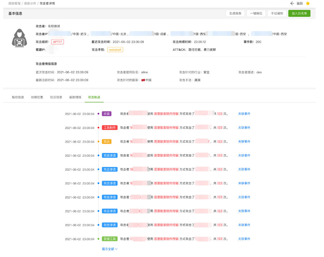 ÔöÌí¹¥»÷Õß»­ÏñÐÅÏ¢£¬»ùÓÚÃÛ¹Þ¡¢Á÷Á¿Êý¾Ý¡¢¹¥»÷ÐÐΪ¡¢Ç鱨µÈ¶àÔ´Êý¾Ý£¬×Ô¶¯½¨Ä£ÌáÁ¶ÍøÂçÖеÄÒÉËÆ¹¥»÷Õߣ¬²¢Ìṩ¹¥»÷Õß½ÓÄɵĹ¥»÷ÌØÕ÷¡¢¹¥»÷Ç鱨ÐÅÏ¢¡¢¹¥»÷ÊÖÒÕºÍÕ½ÊõÐÅÏ¢£¬ÌáÉý¹¥·ÀÑÝÁ·³¡¾°Ï·ÀÊØ·½ËÝÔ´ÄÜÁ¦¡£